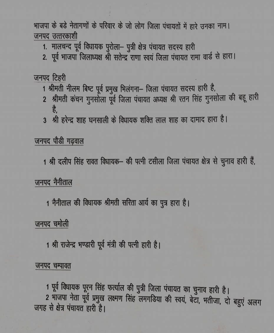 कांग्रेस प्रदेश अध्यक्ष की माने तो देहरादून, पौड़ी, चमोली जैसे जिलों में कांग्रेस का प्रदर्शन अच्छा रहा है। पंचायत चुनाव में उत्तराखंड की जनता ने कांग्रेस को अपना आशीर्वाद दिया है। भाजपा भले ही प्रदेश कार्यालय में जीत का जश्न मना रही हो लेकिन भाजपा के प्रदेश अध्यक्ष महेंद्र भट्ट अपना बूथ पंचायत चुनाव में हार गए, इतना ही नहीं बीजेपी के कई विधायकों के रिश्तेदार भी चुनाव में हार गए भाजपा विधायक दिलीप सिंह रावत की पत्नी जिला पंचायत सदस्य का चुनाव हार गई नैनीताल विधायक सरिता आर्या का पुत्र भी चुनाव हार गए, वहीं पूर्व कैबिनेट मंत्री राजेंद्र भंडारी की पत्नी जो चमोली जिले की निवर्तमान जिला पंचायत हैं रजनी  भंडारी हैं वह भी चुनाव हार गई,बीजेपी के ही पूर्व विधायक पूरन सिंह फर्त्याल की पुत्री जिला पंचायत सदस्य का चुनाव हार गई,बीजेपी की कई ऐसे बड़े नेताओं की रिश्तेदार हैं जो पंचायत चुनाव हार गए लेकिन बीजेपी जो जीत का दावा कर रही है वह पूरी तरीके से निराधार है।
