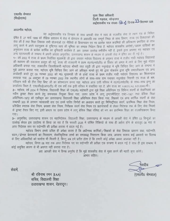शिक्षा विभाग में प्रमोशन को लेकर शिक्षक ही परेशान नहीं है, अधिकारी भी परेशान नजर आ रहे हैं,टिहरी जिले के मुख्य शिक्षा अधिकारी एसपी सेमवाल ने तो अपना इस्तीफा शिक्षा सचिव को भेज दिया है, एसपी सेमवाल भी अपना प्रमोशन ना होने से नाराज बताए जा रहे हैं।