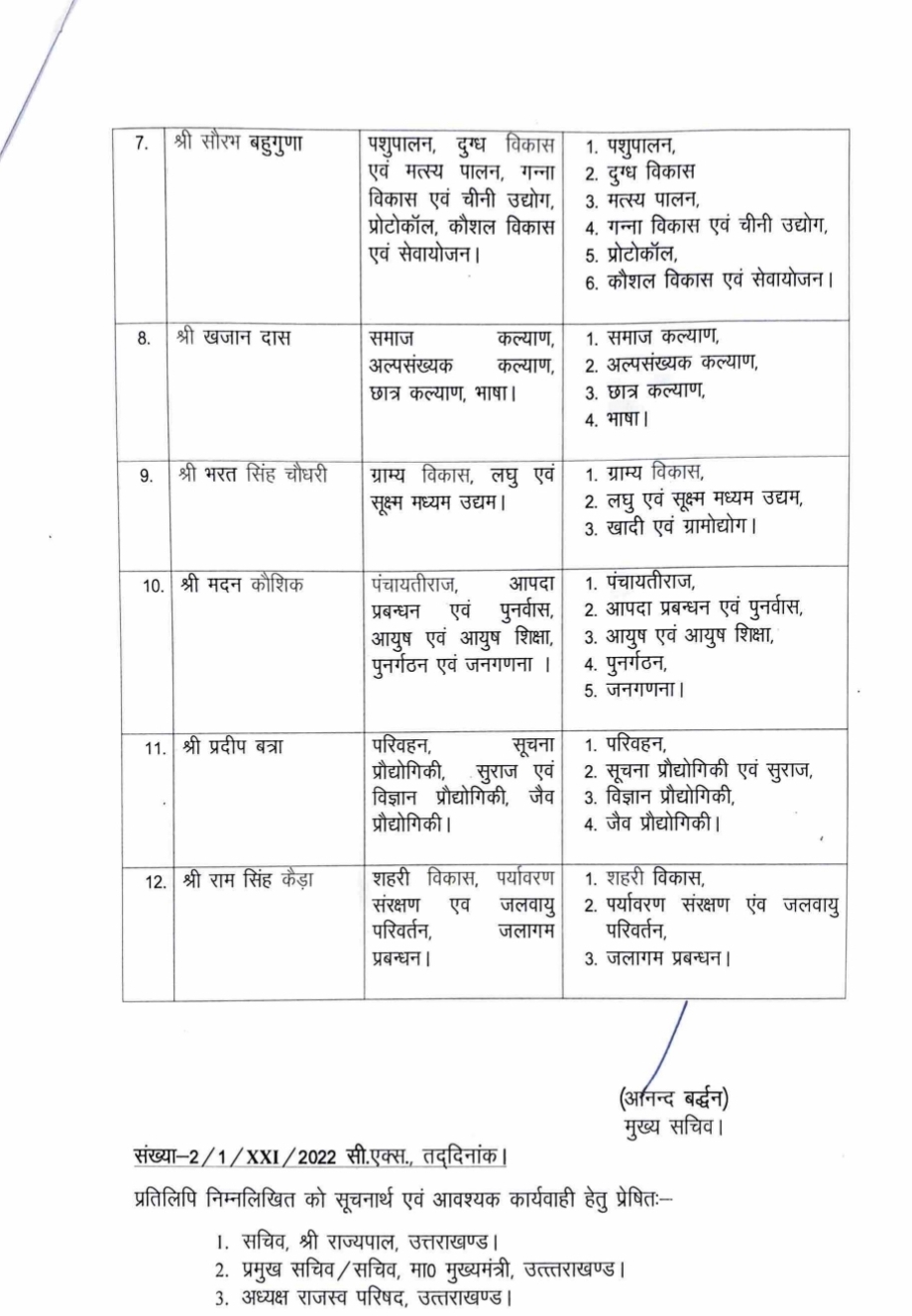 देहरादून। मुख्यमंत्री ने मंत्रिमंडल विस्तार के बाद मंत्रियों के बीच विभागों का बहुप्रतीक्षित बंटवारा कर दिया है। हाल ही में पाँच नए मंत्रियों के शपथ ग्रहण के बाद किए गए इस आवंटन में मुख्यमंत्री ने कई महत्वपूर्ण और संवेदनशील प्रशासनिक विभाग अपने पास ही रखे हैं। अब तक मुख्यमंत्री के पास 35 से अधिक विभागों का दायित्व था।